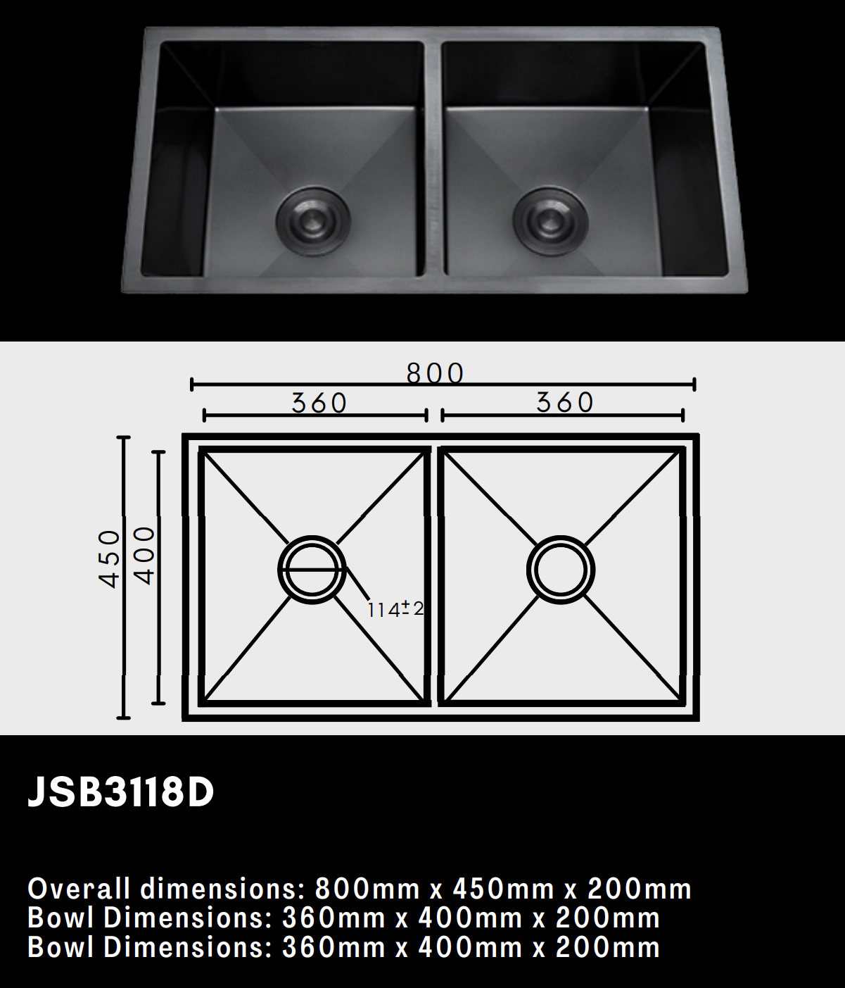 Luxury Double Bowl Kitchen Sink 800x450mm - Black Matt - JSB3118A
