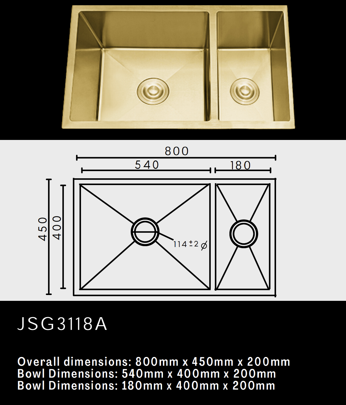 Luxury Double Bowl Kitchen Sink 800x450mm - Gold - JSG3118A