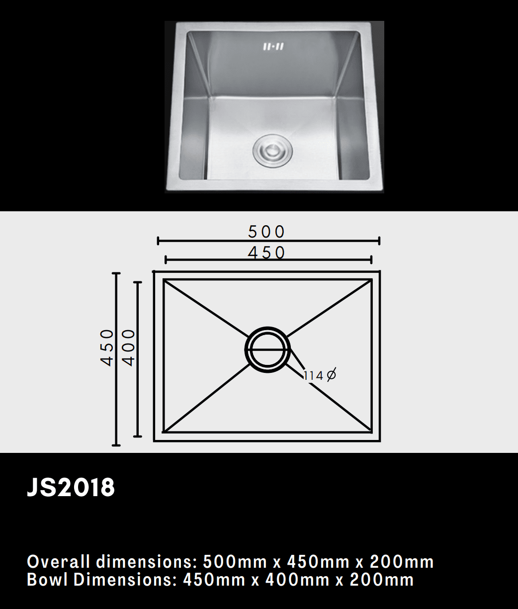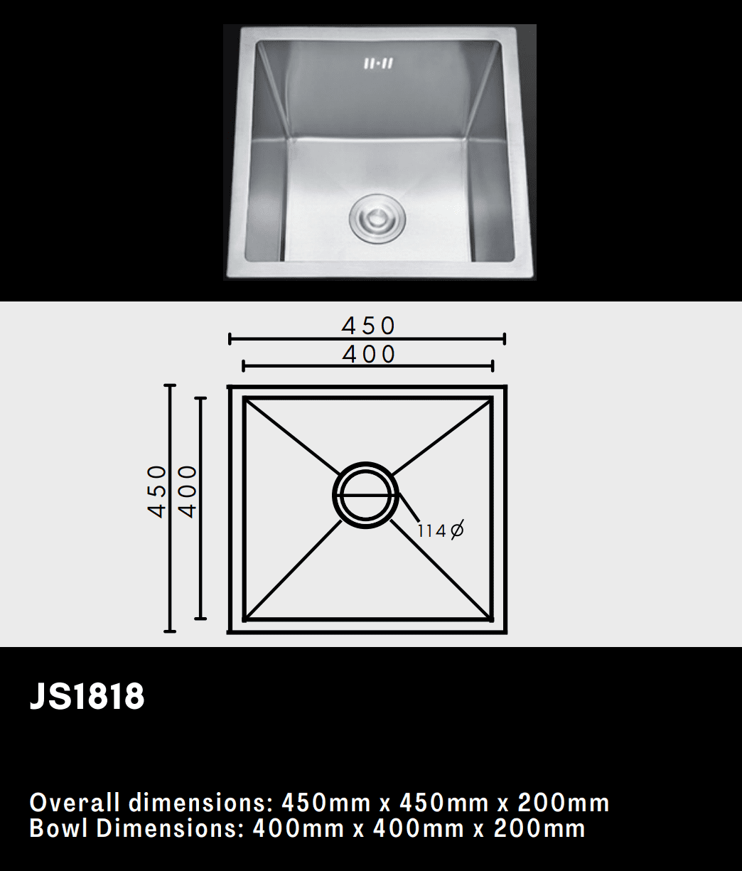 Premium Single Bowl Kitchen Sink 450x450mm - Stainless Steel - JS1818