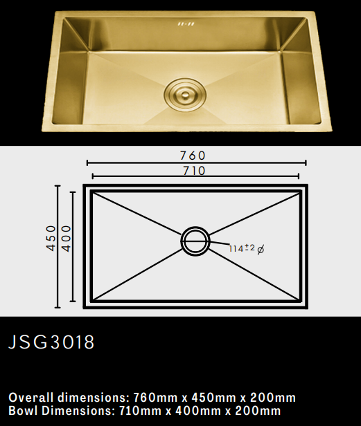 Luxury Single Bowl Kitchen Sink 760x450mm - Gold - JSG3018
