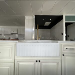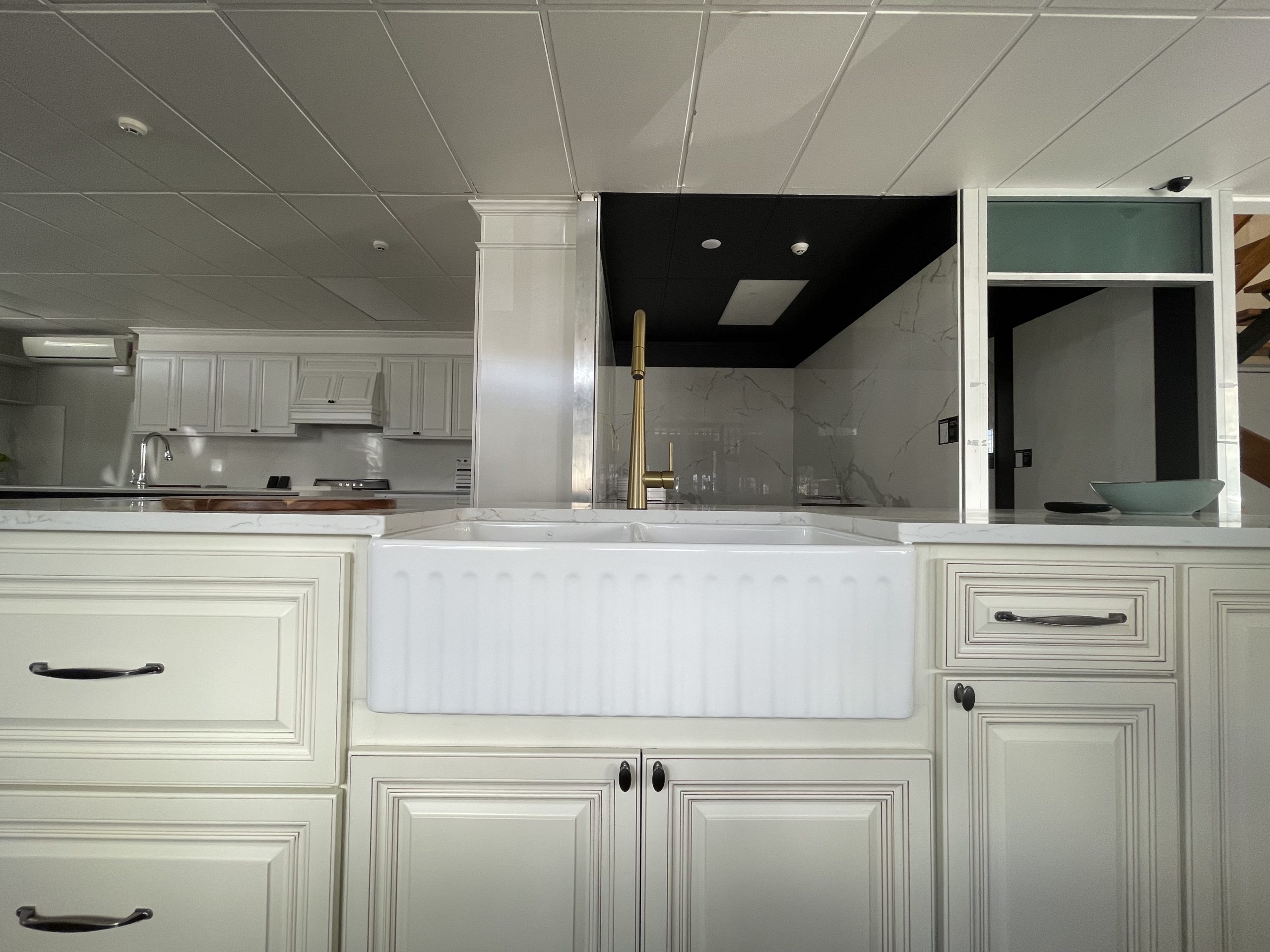 An elegant butler double bowl sink featuring a ribbed profile with a durable ceramic glazed finish.
