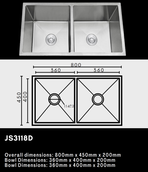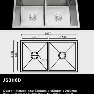 Upgrade your kitchen with the JS3118D Double Bowl Sink, expertly crafted in premium stainless steel. With a generous 800x450mm size, this modern sink features two spacious, equally sized bowls—perfect for streamlining food preparation, dishwashing, and cleanup in busy households or semi-professional kitchens.