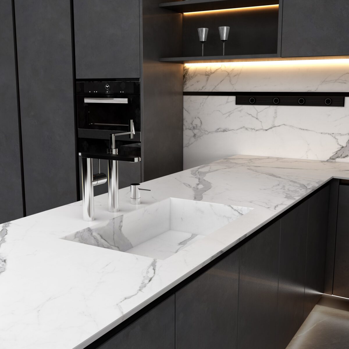 Use Horizon Stone Statuario Matt extensively in domestic and commercial installations as your reliable sintered stone. This is a durable and easy care solution for kitchen benchtops and other surfaces, and the aesthetic accuracy of white marble with striking grey veining makes it possible to achieve a valuable and beautiful result. It also has all the advantages of sintered stone with a nonporous surface and stain-resistant surface.