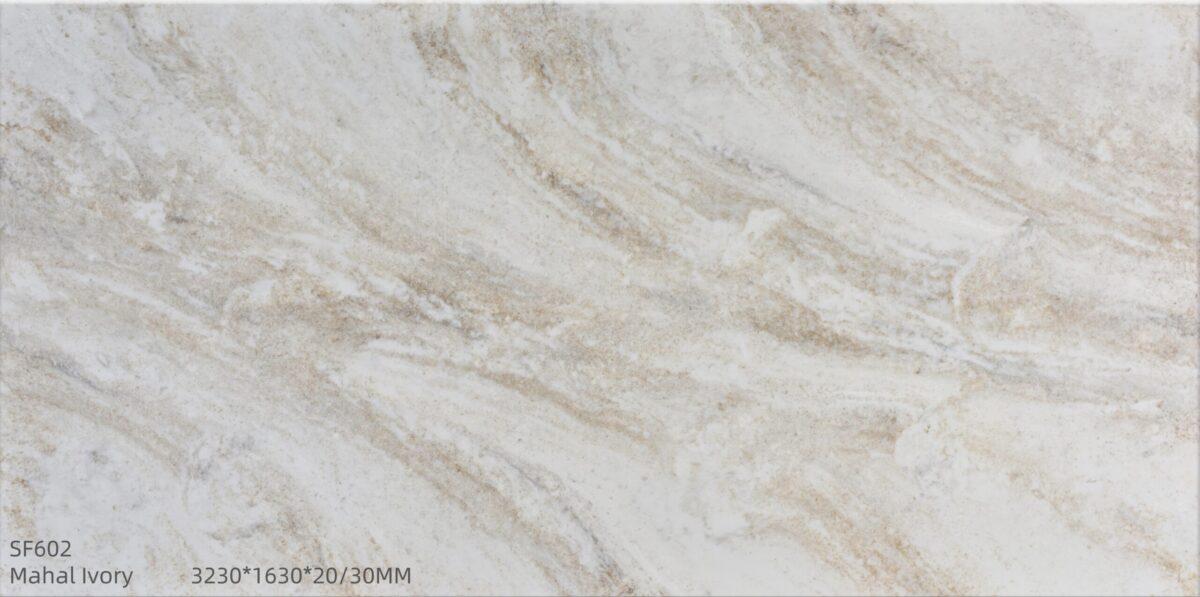 SF602 Mahal Ivory brings earthy elegance into your kitchen with its soft ivory base and flowing golden-beige veining that mimics the beauty of natural sandstone. This surface delivers a warm, welcoming tone that pairs effortlessly with both light and dark cabinetry—perfect for classic, coastal, or rustic-style interiors seeking natural warmth and character.