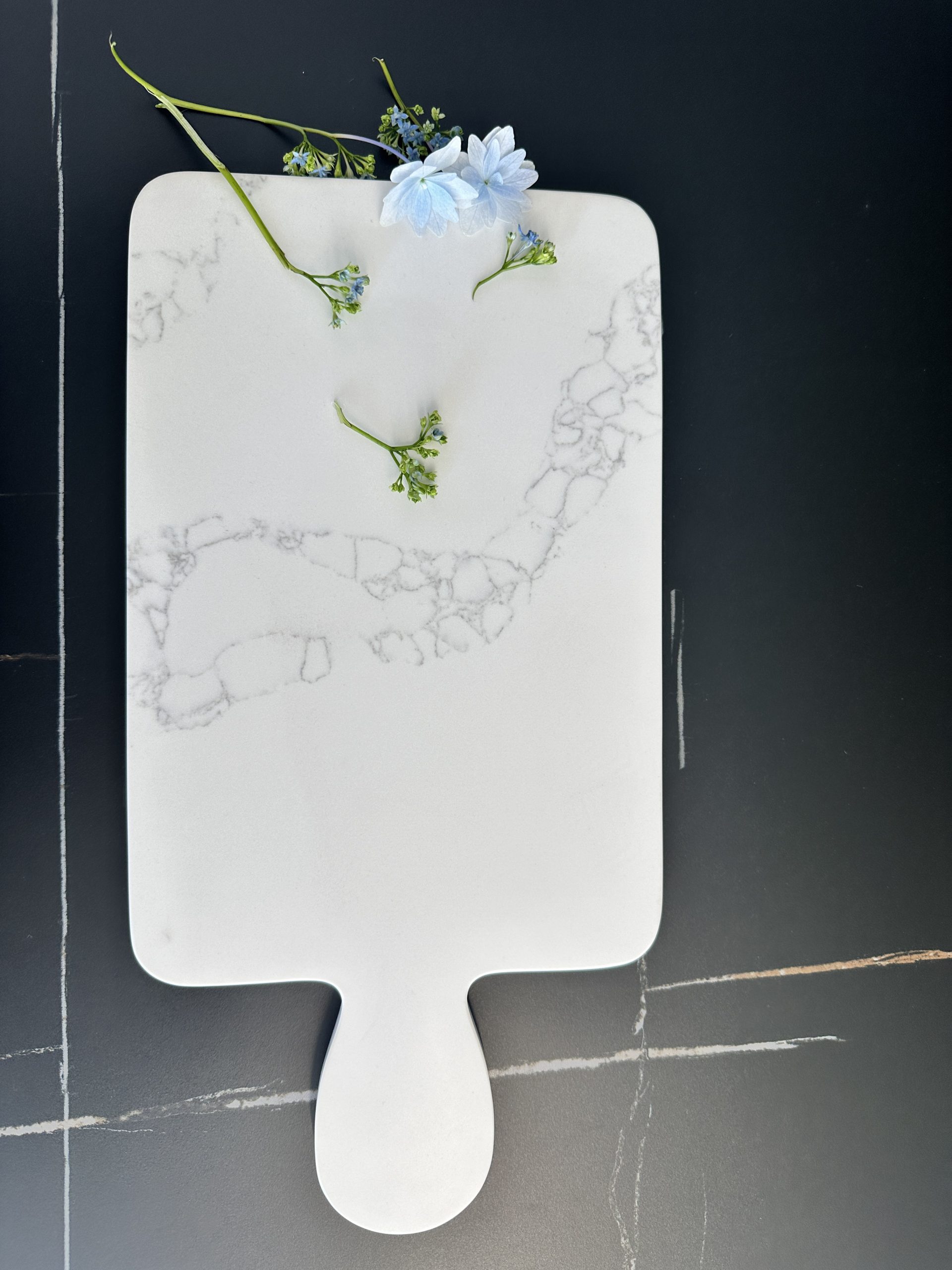 Celebrate in style, show off your charcuterie skills and impress your guests with the exquisite natural stone look serving board by Jerry Kitchen & Bath.